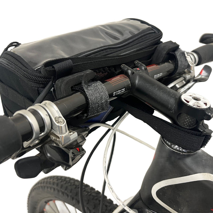 Everything you need for an all day ride, close at hand. The Buddy Handlebar bag mounts to your handlebars with hook and loop attachment along bars and frame. Features a large main compartment, separate dual accessible phone compartment, lanyard, and easy to grab zipper pulls. Opens up completely for easy access. Loop molle on the front so can attach different items. Look around for some cool hook patches that can attach to front of bag.